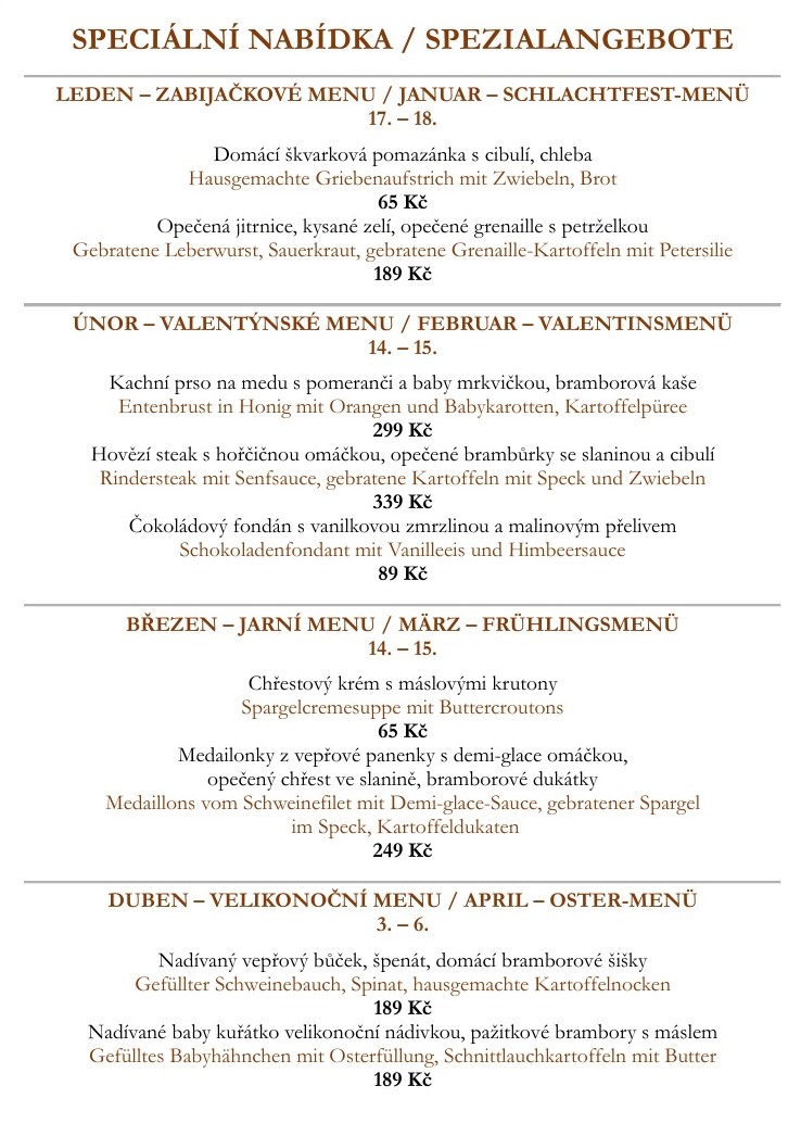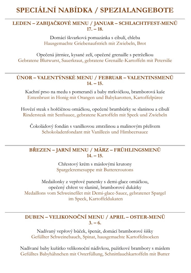 U nás si vždy vyberete z denní nabídky, stálého jídelního lístku a o víkendech připravujeme víkendové speciality. Rovněž jsme schopni Vám zařídit cateringové služby na míru.